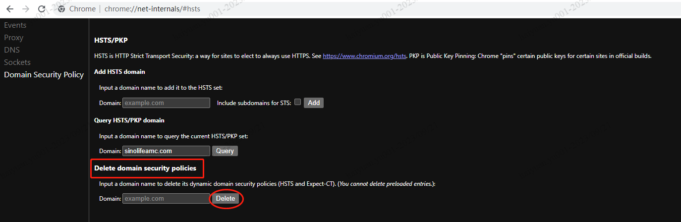 chrome://net-internals/#hsts选择Delete domain security policies,填入需要取消HSTS的域名,然后Delete