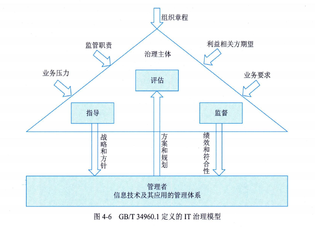 GB/T 34960.1《信息技术服务治理 第1部分:通用要求》规定了IT治理的模型和框架、实施IT治理的原则,以及开展IT顶层设计、管理体系和资源的治理要求。