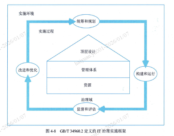 GB/T 34960.2 《信息技术服务治理 第2部分:实施指南》提出了IT治理通用要求的实施指南,分析了实施IT治理的环境因素,规定了IT治理的实施框架、实施环境和实施过程,并明确顶层设计治理、管理体系治理和资源治理的实施要求。